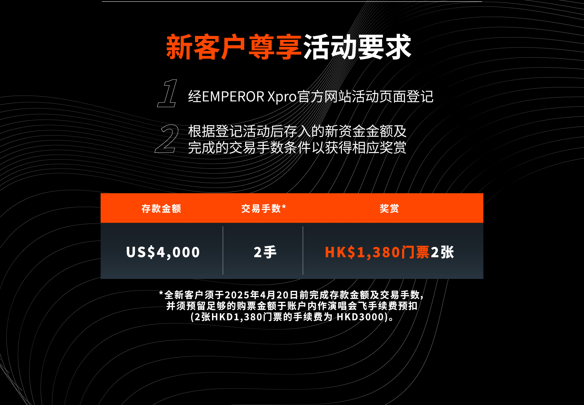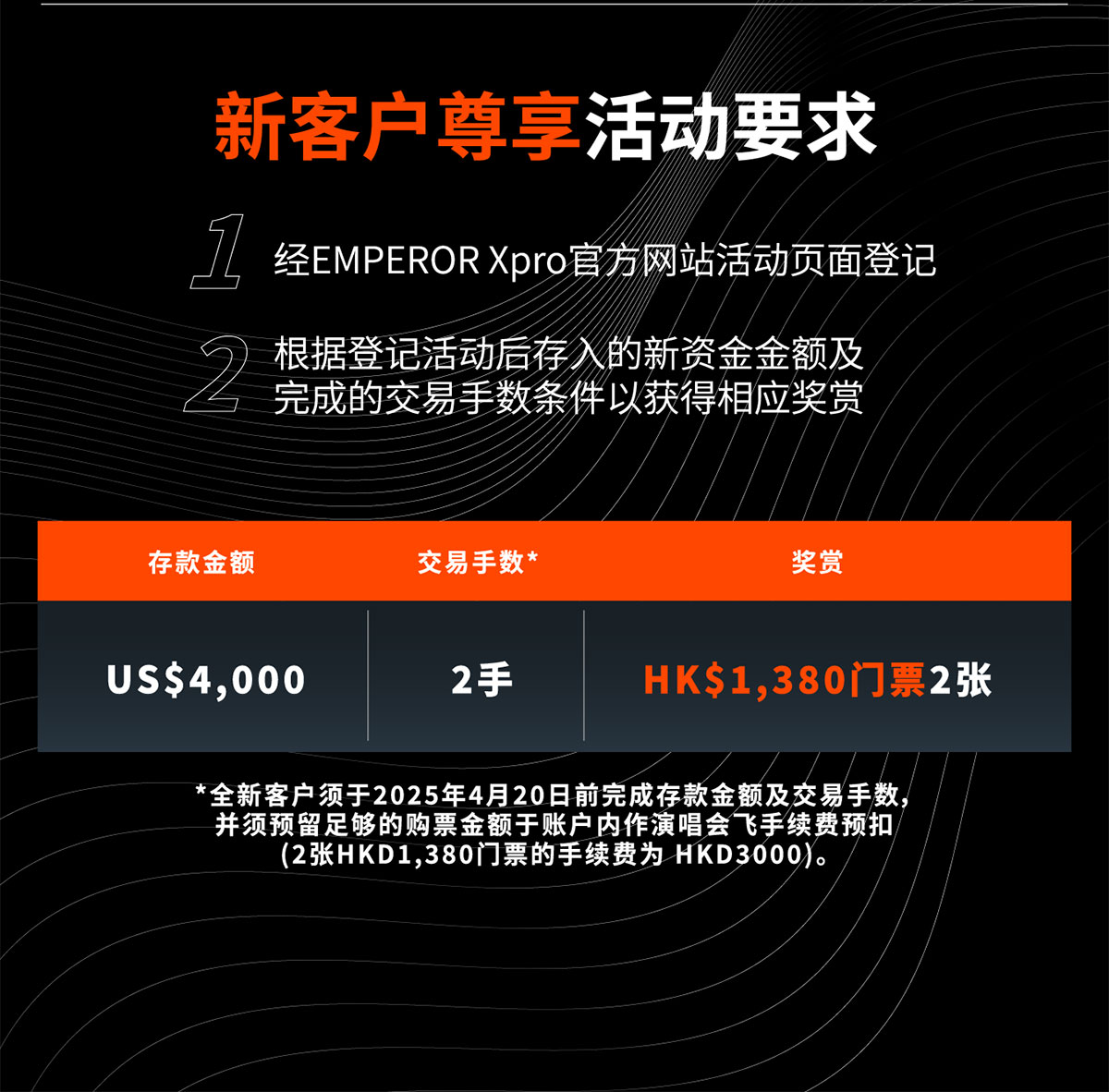 - 于之前版本条款及细则下被定义为「全新客户」 (即 2025 年 2 月 1 日前首次开户),但于此低门坎推广活动中不再符合「全新客户」定义之客户,若于 2025 年 4 月 20 日前已完成 US$4,000 之存款及 2 手交易要求,将自动获得购买 2 张 HK$1,380 门票之资格。