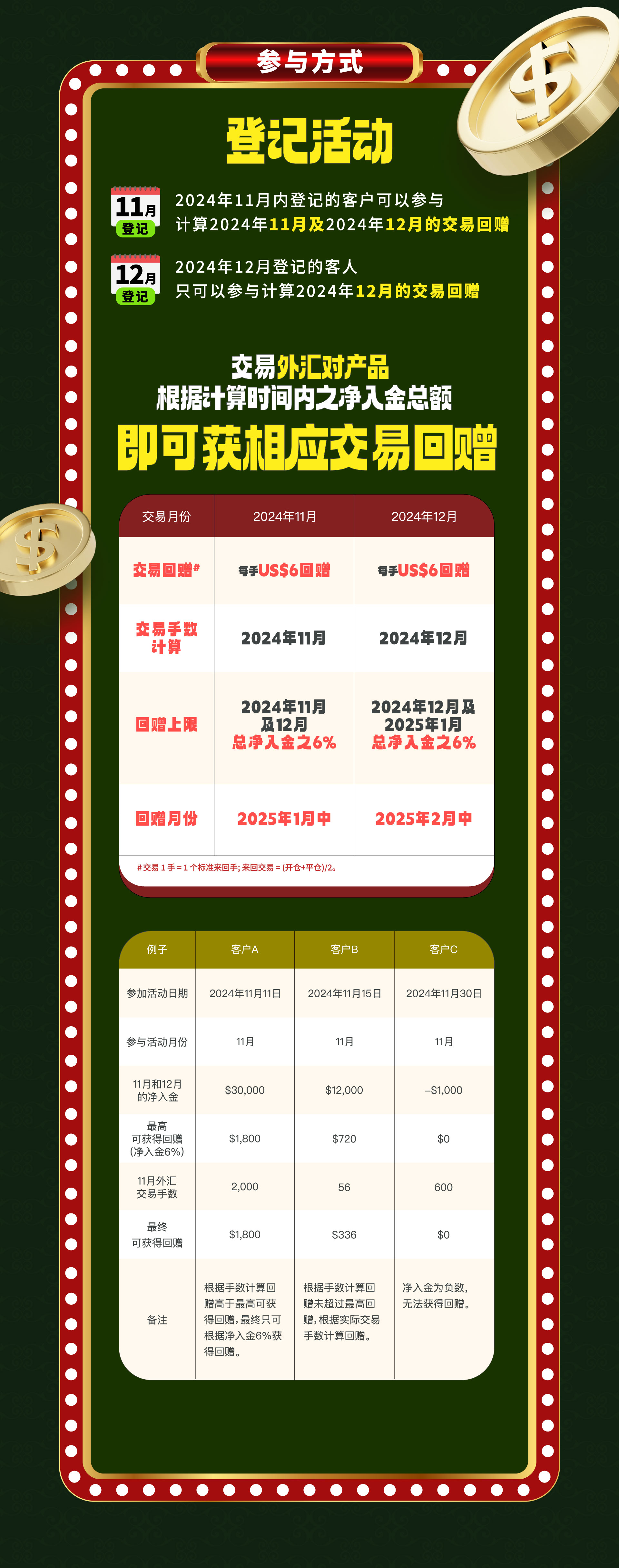 - 11月交易活动交易手数統計日为2024年11月1日至11月30日止,总净入金统计日期为2024年11月1日至12月31日止。